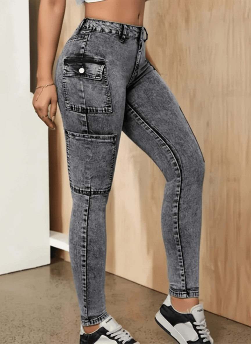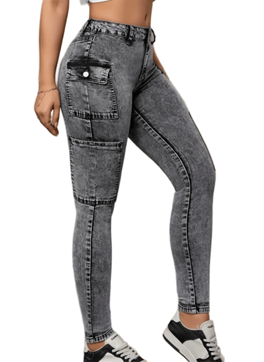 Estos jeans combinan una silueta ajustada con un tejido elástico y flexible para un movimiento cómodo a diario. Los tonos negro y gris crean un look moderno y depurado, mientras que el corte ajustado hasta el tobillo aporta estructura. Los bolsillos laterales ofrecen un práctico espacio de almacenamiento, y el material suave aumenta la comodidad durante largos periodos, lo que los convierte en ideales para looks casuales o elegantes.