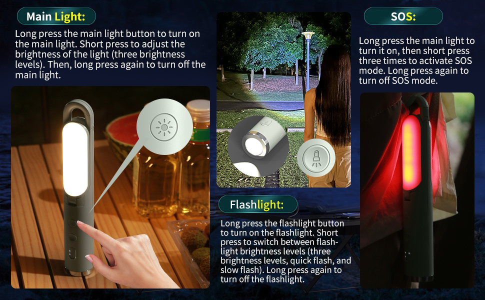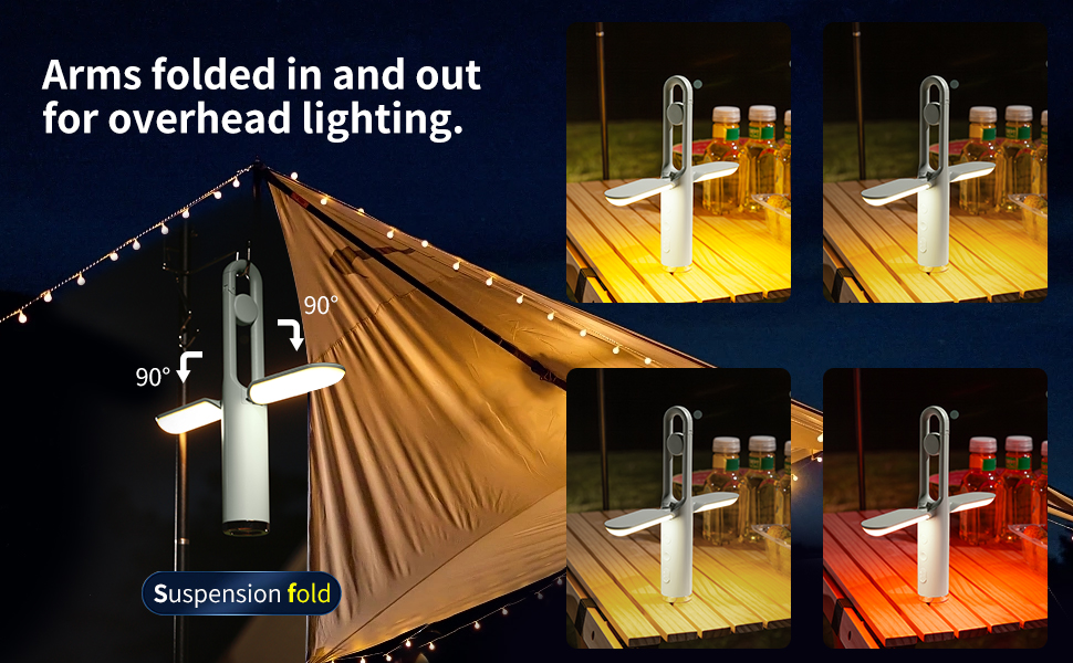 Esta linterna está diseñada como una solución de iluminación integral para acampar, emergencias y uso diario. Combina una luz de área de 360°, una linterna enfocada y una lámpara de mesa estable en un diseño compacto. Con brazos plegables, múltiples modos de iluminación y batería recargable, esta linterna proporciona una iluminación fiable dondequiera que se necesite.