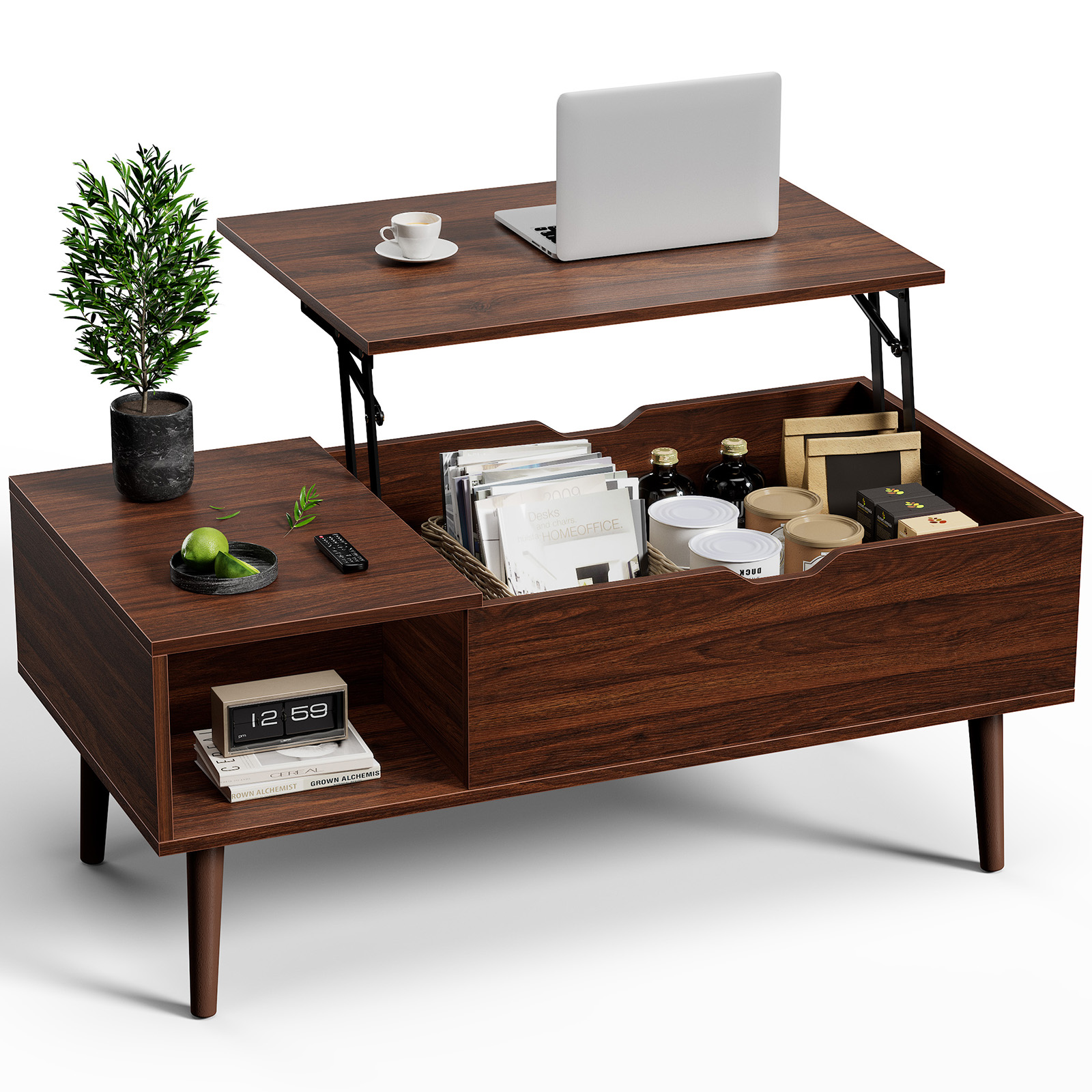 This coffee table is designed to combine functionality and modern style with a lift top mechanism. The coffee table allows the surface to be elevated, transforming it into a workspace or dining area. With hidden storage compartments and side shelves, this coffee table helps keep living spaces organized while maximizing usability.