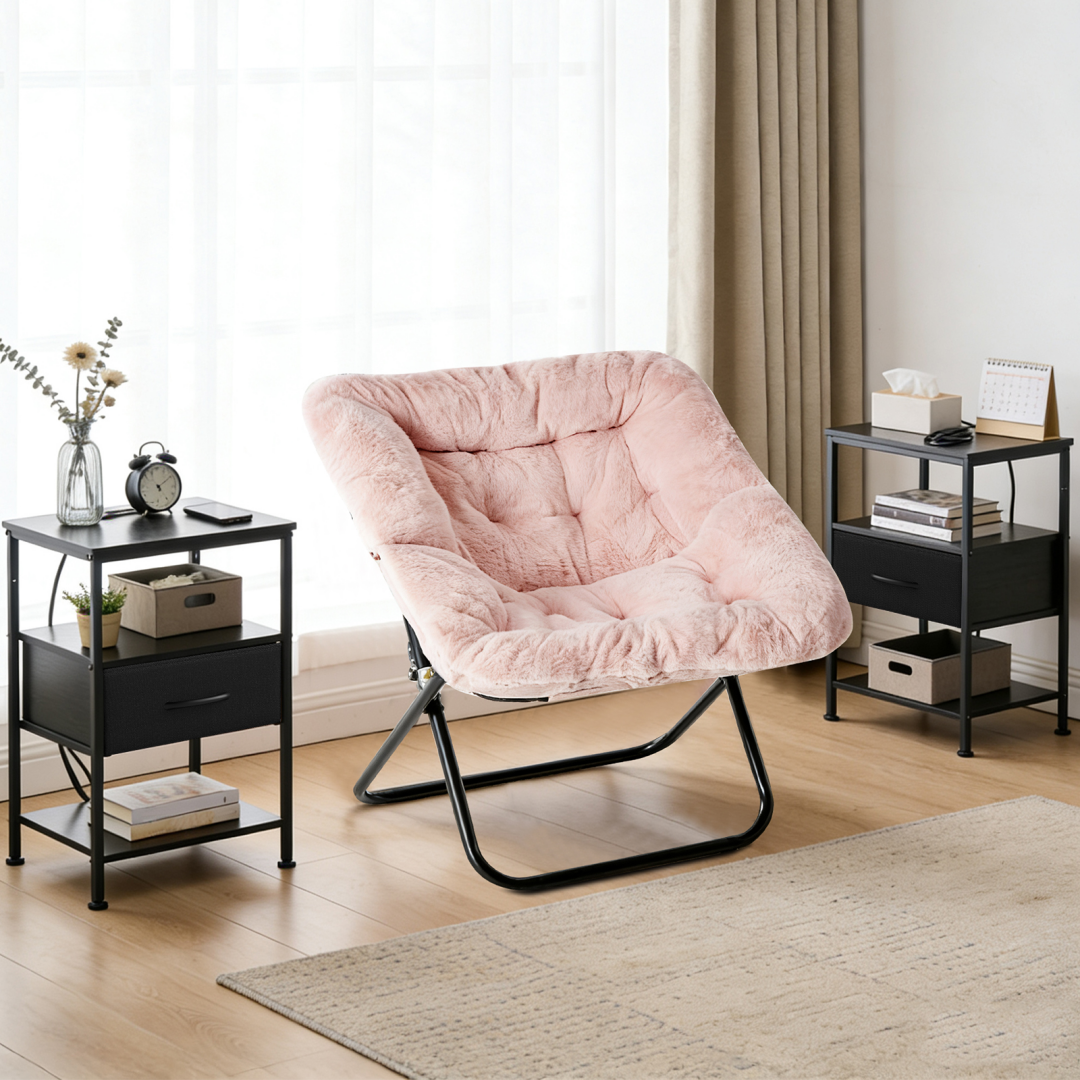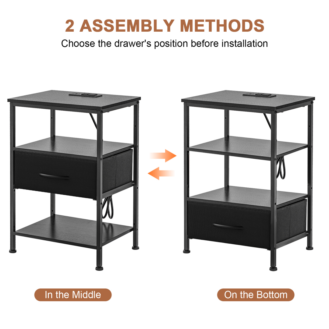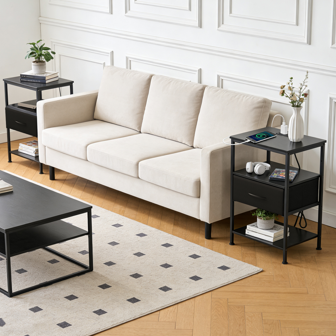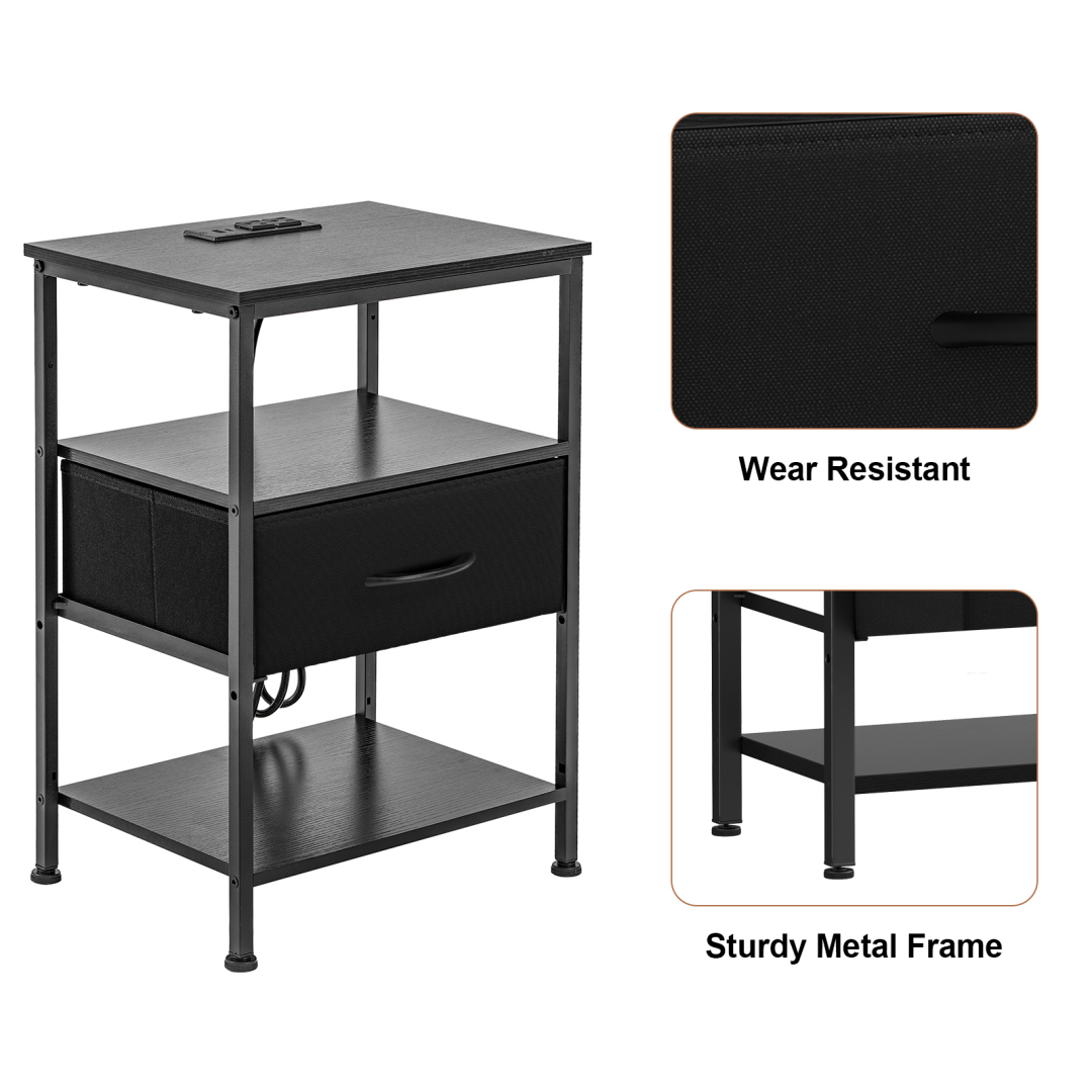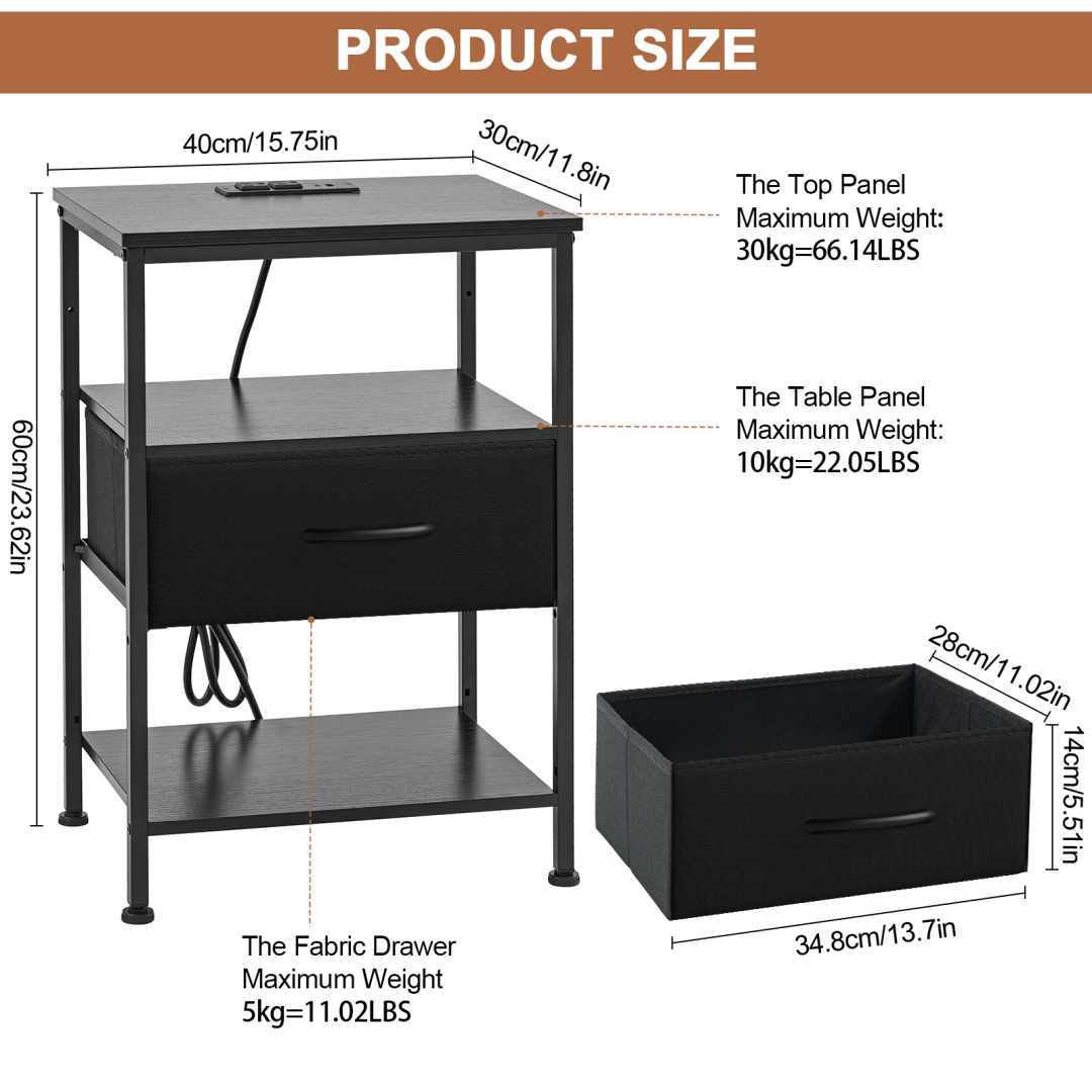 Esta mesita de noche está diseñada para combinar la comodidad de la carga con un almacenamiento flexible. Con una estación de carga integrada, mantiene los dispositivos esenciales cargados y al alcance. Con estantes ajustables y un cajón de tela, esta mesita facilita la organización de las rutinas nocturnas en espacios pequeños o modernos.