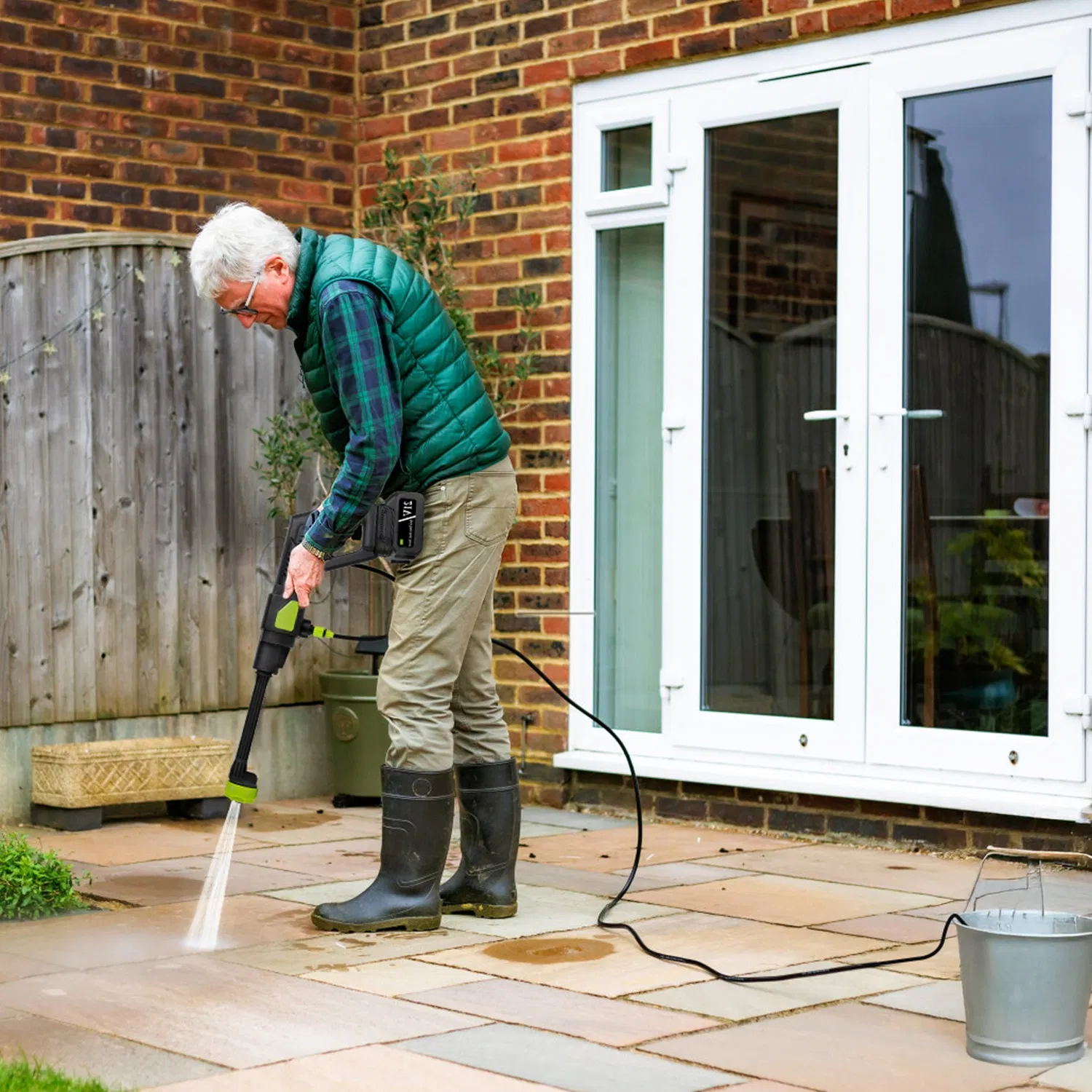 La hidrolavadora proporciona libertad inalámbrica para la limpieza de exteriores.