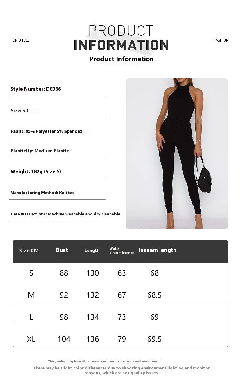 This women’s halter jumpsuit blends sleek streetwear style with a flattering silhouette. Crafted from polyester fiber, the halter jumpsuit offers durability, stretch, and comfort for daily wear or evening outings. Featuring a sleeveless halter neckline and open back, the halter jumpsuit highlights a modern design, while slim-fit trousers elongate the figure in a stylish and versatile way.