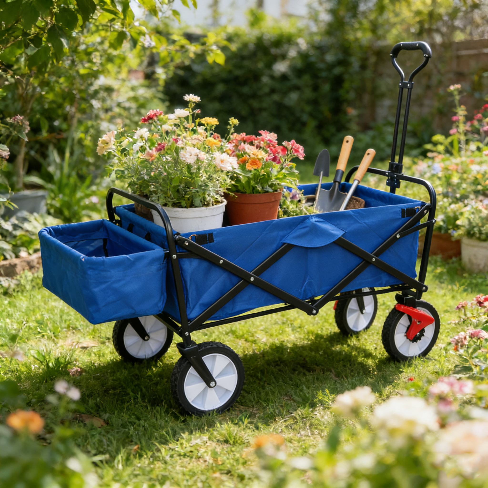 . Folding utility cart adapts to garden, beach, and shopping needs