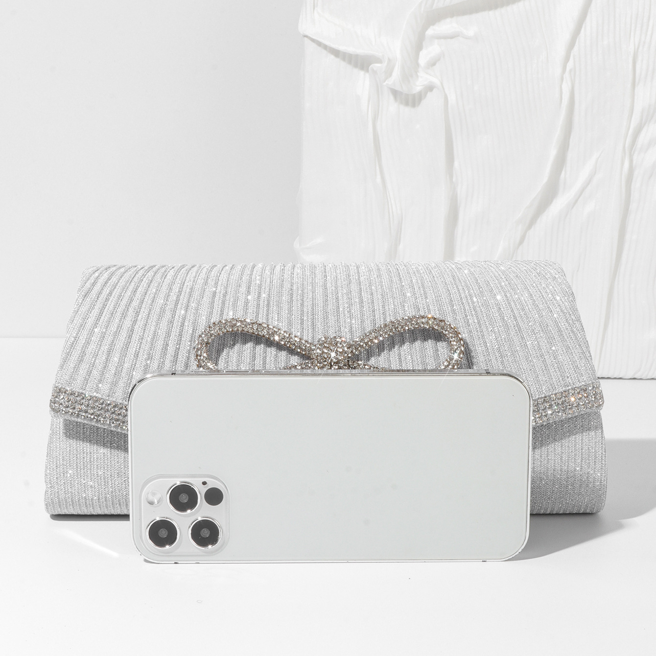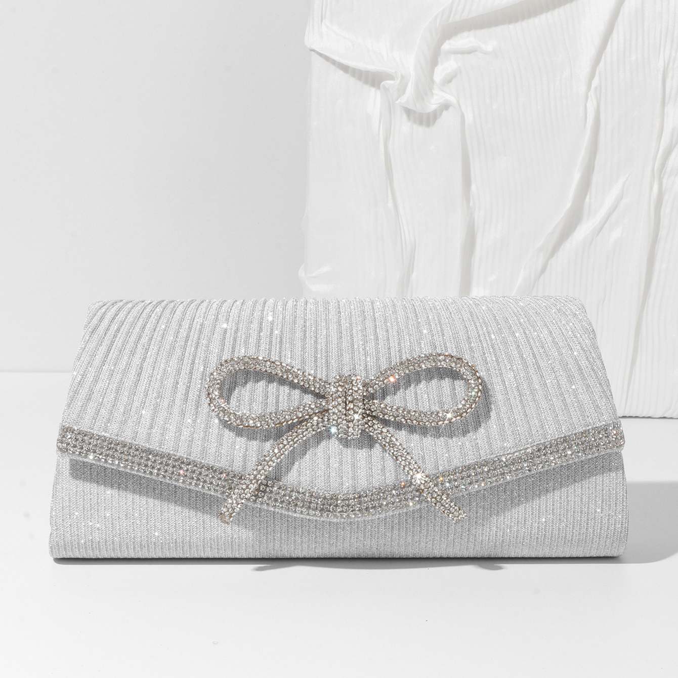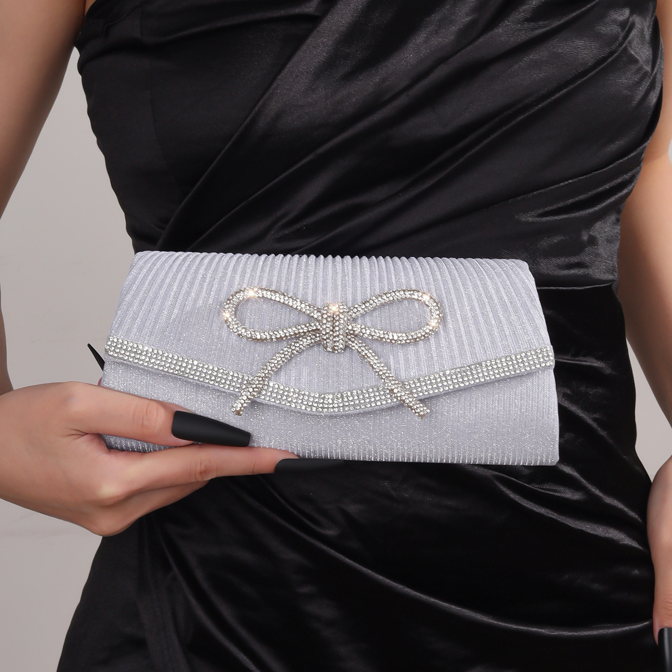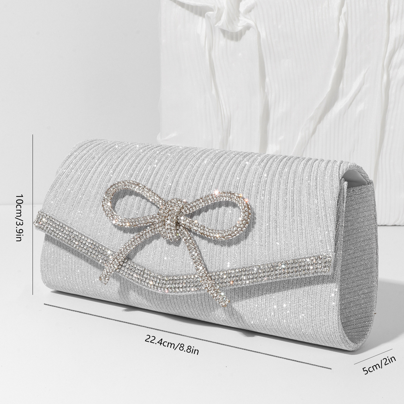 .Rhinestone bow enhances elegant appeal