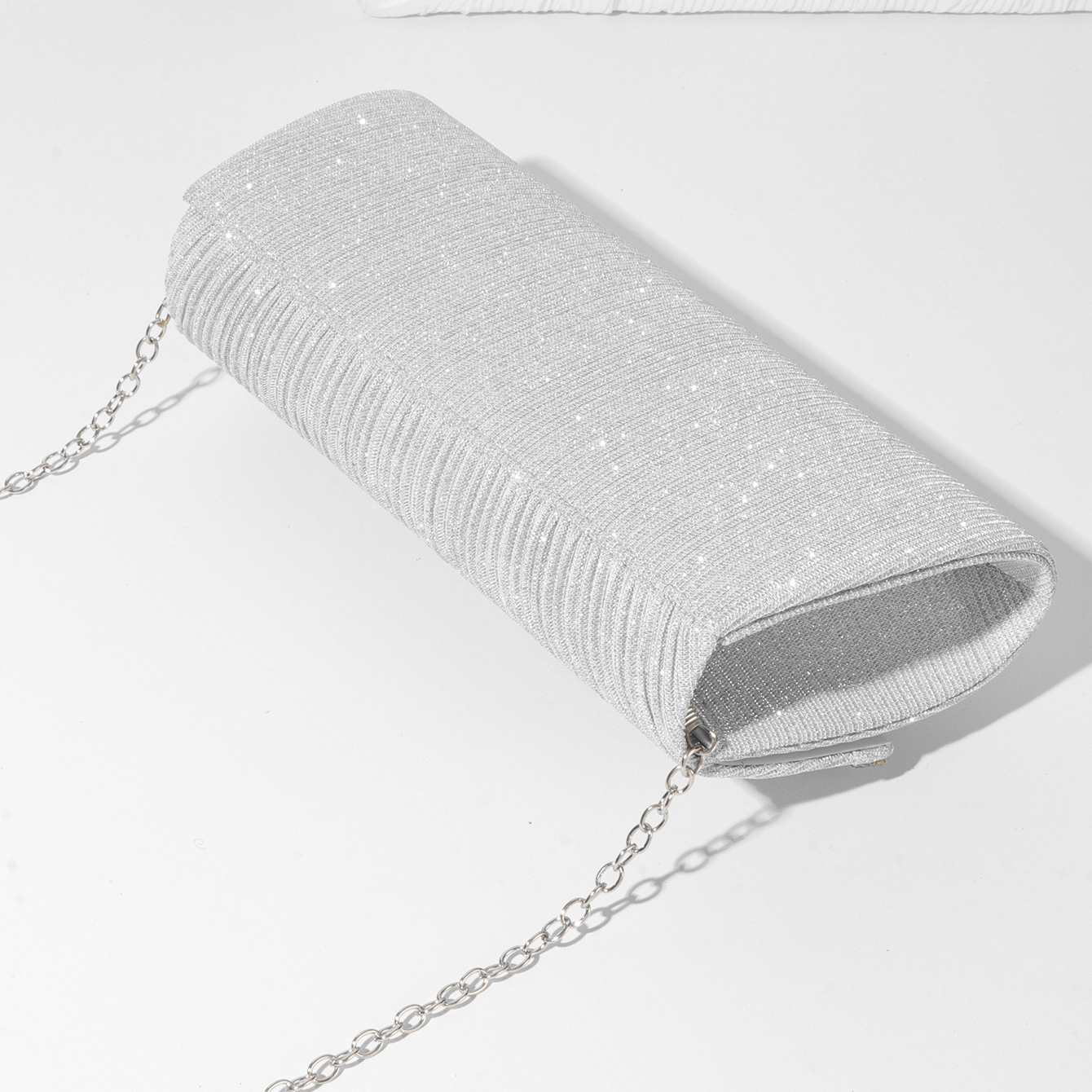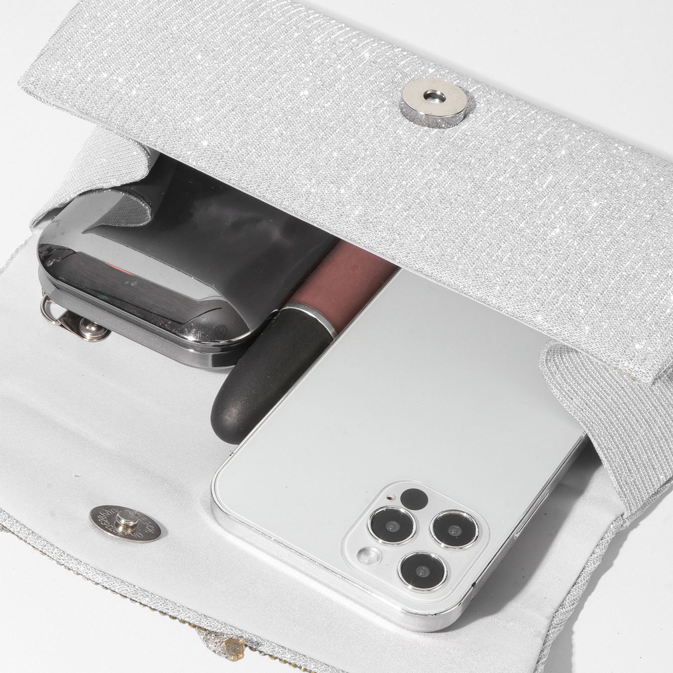 This clutch bag features a radiant rhinestone bow detail combined with a glitter finish for formal occasions. Designed in an elegant envelope silhouette, the clutch bag offers a refined structure suitable for weddings and evening events. The detachable chain allows the clutch bag to be worn as a handheld purse or crossbody accessory.