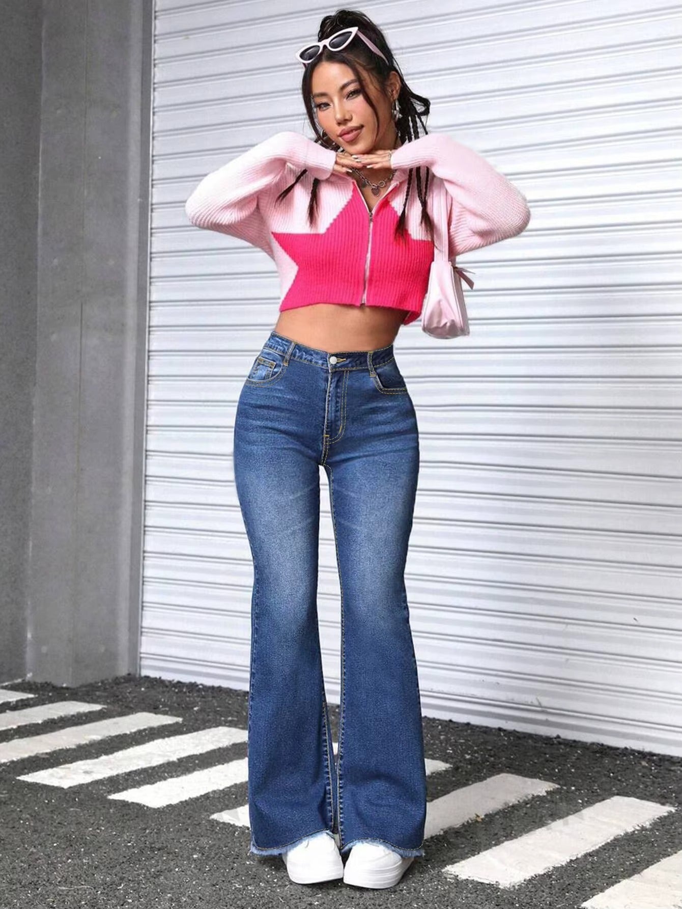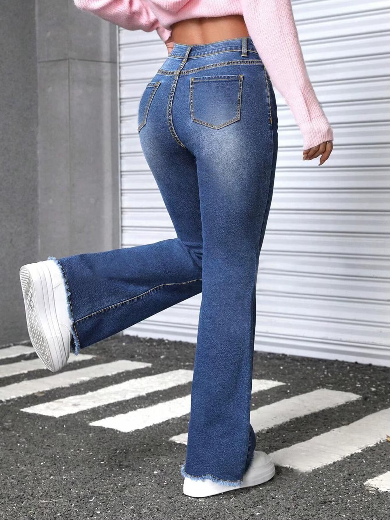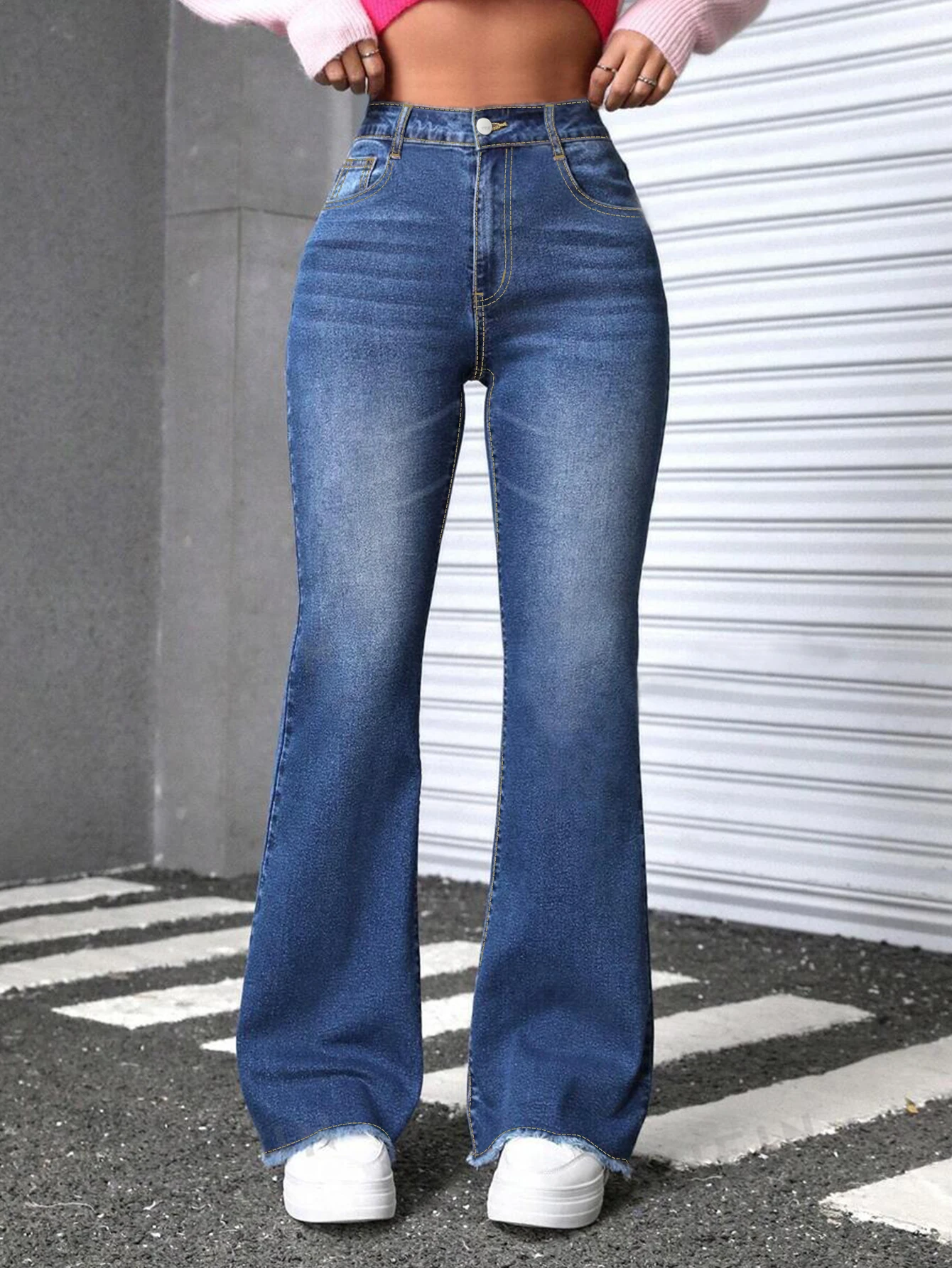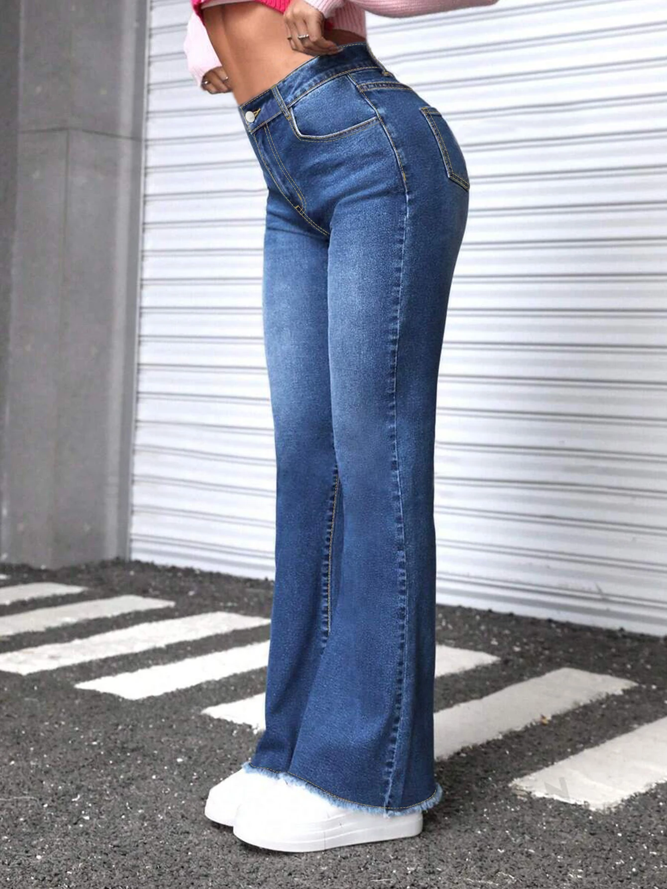 These women’s jeans combine a high stretch denim blend with a wide leg flared design for relaxed movement and a bold silhouette. The long tassel hem adds texture while maintaining a clean vintage inspired look. The high waist structure shapes comfortably, and the washable woven fabric keeps its feel across seasons.